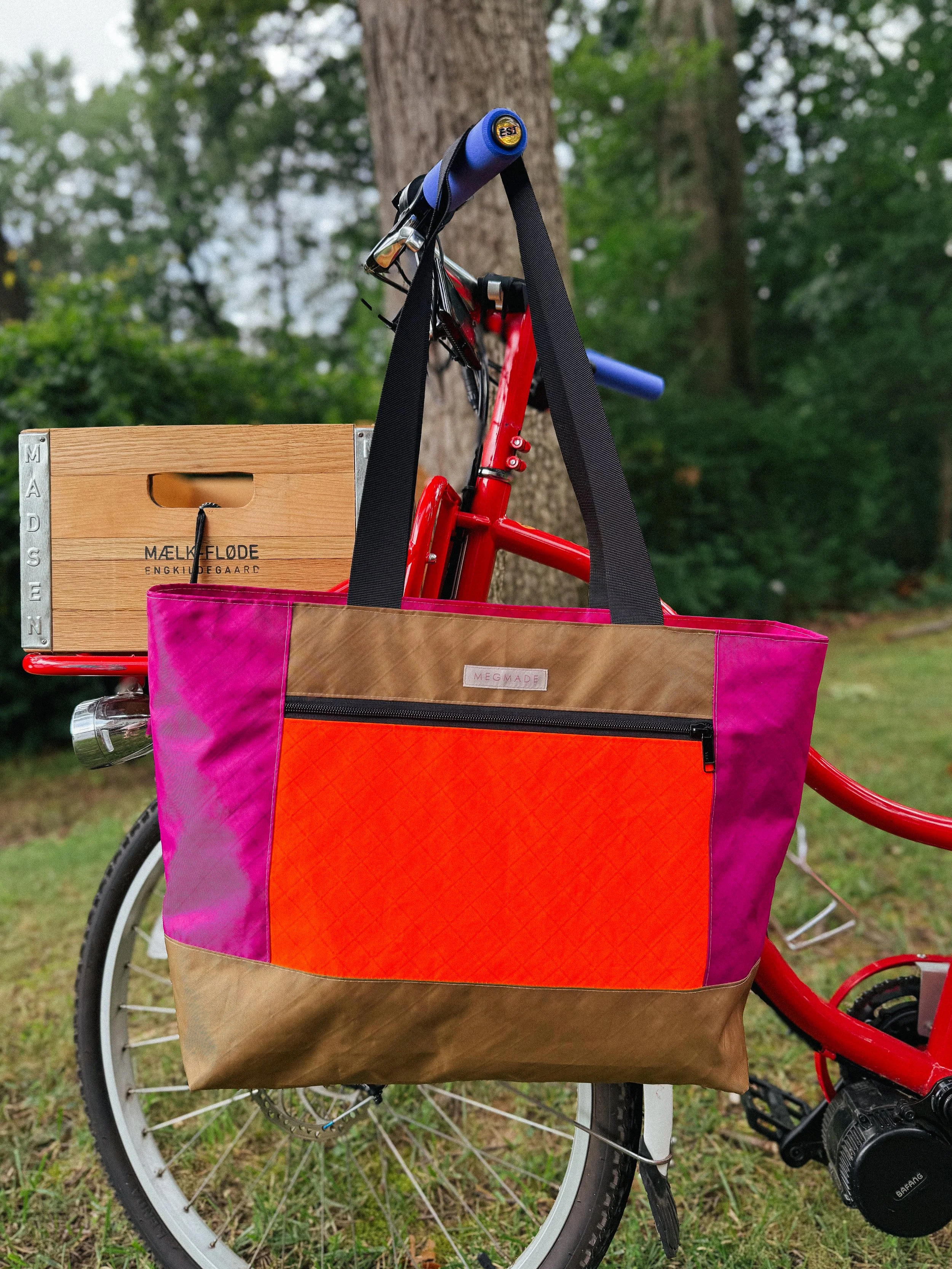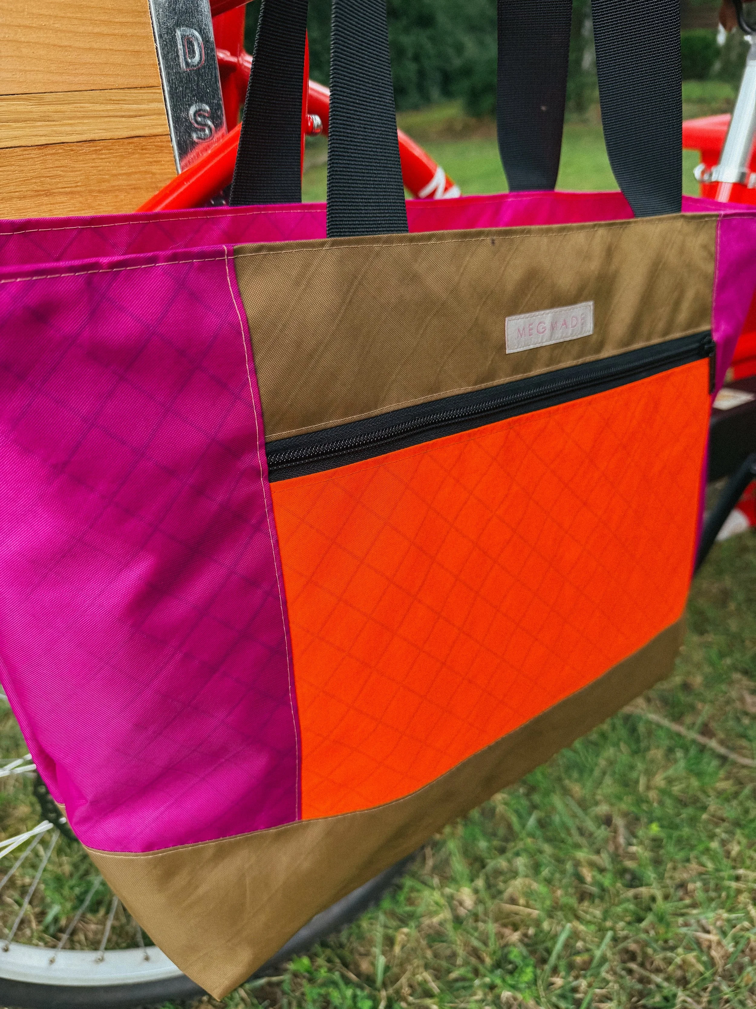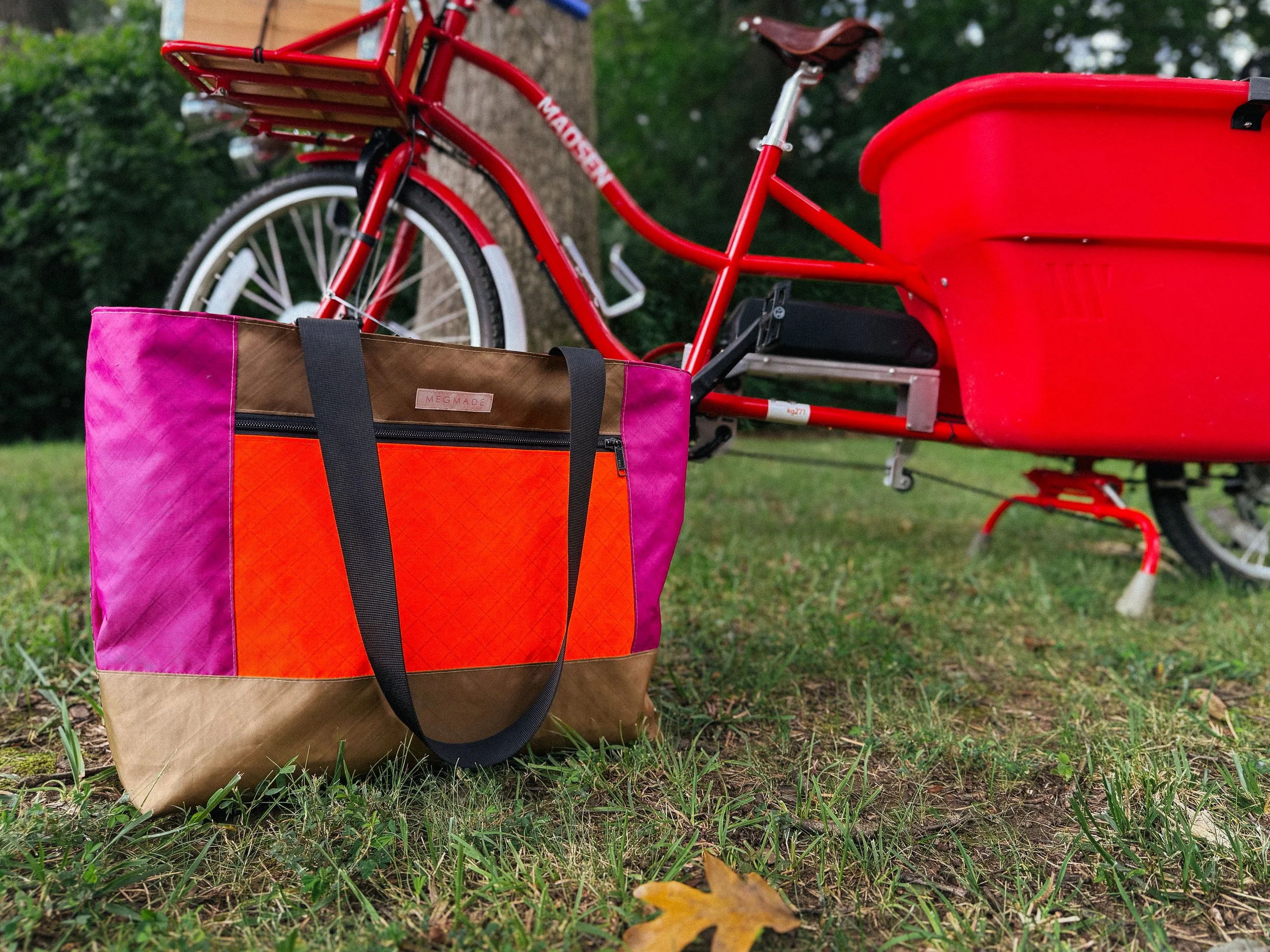 After chatting with the folks at ReFasten, I decided to make a zippered tote bag. While these fabrics are certainly ideal for outdoorsy gear like day packs and bike bags, they also work well for accessories that could benefit from water and wear resistance, even if they’re not necessarily being used on a rugged adventure. For me, a tote bag that’s sturdy, water resistant, and easy to wipe down is an essential as a mom of four kids. This bag is great for picnics, beach days, and even fits nicely in our cargo bike’s basket.